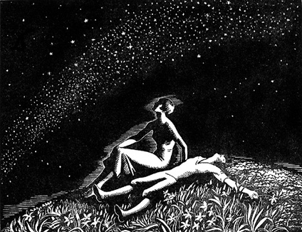 A pen-and-ink illustration of the two main characters looking up at the Milky Way.